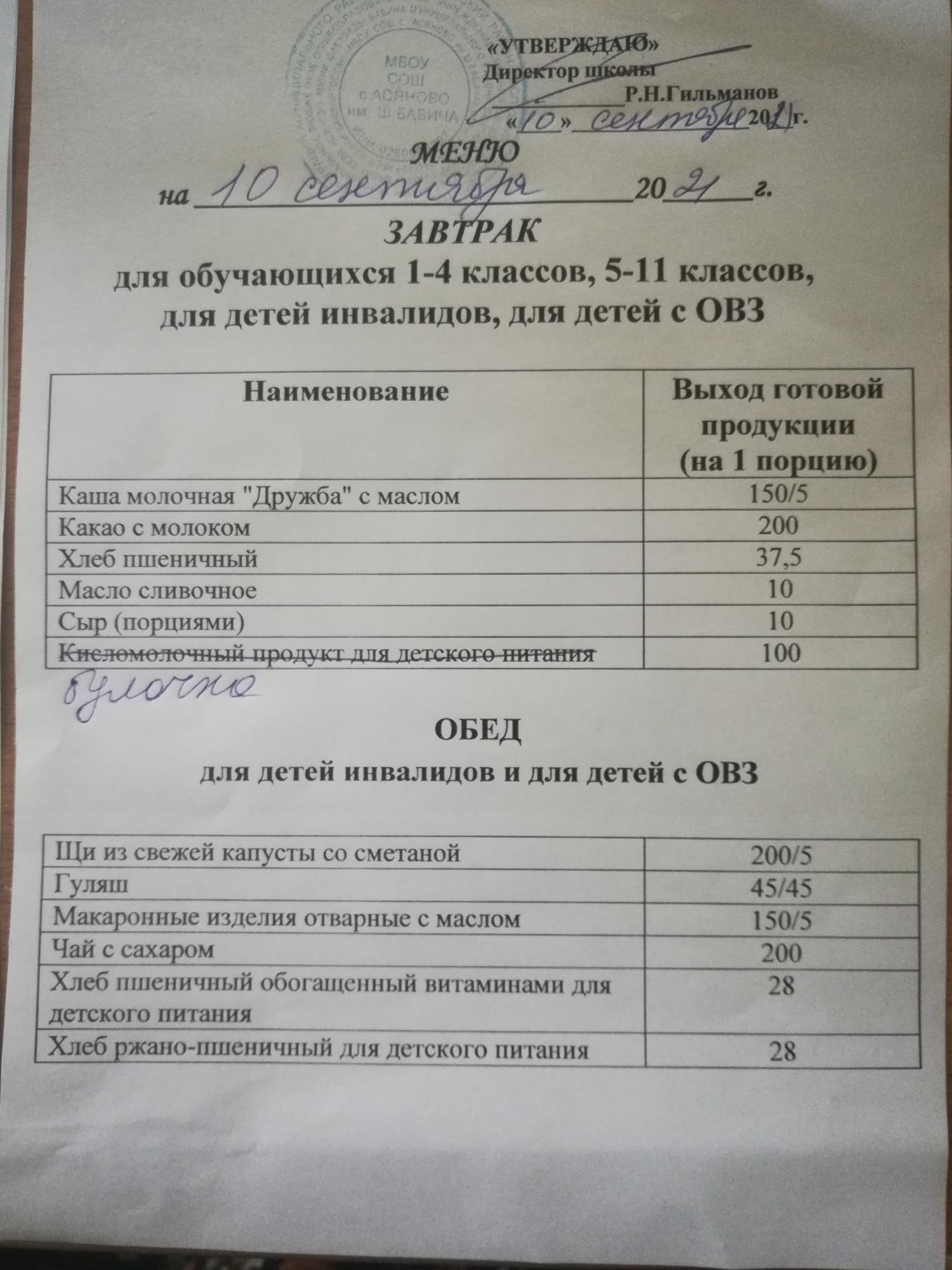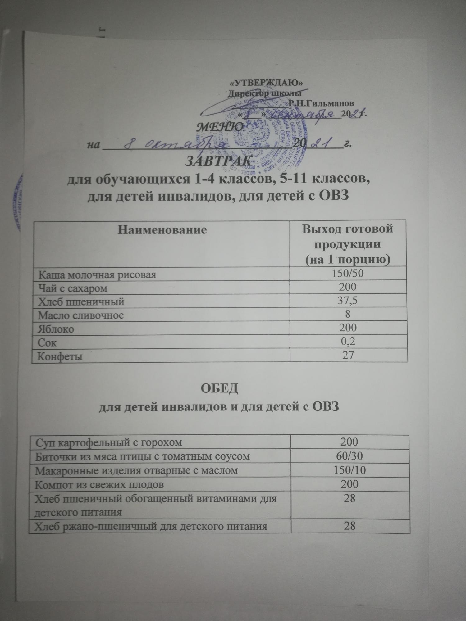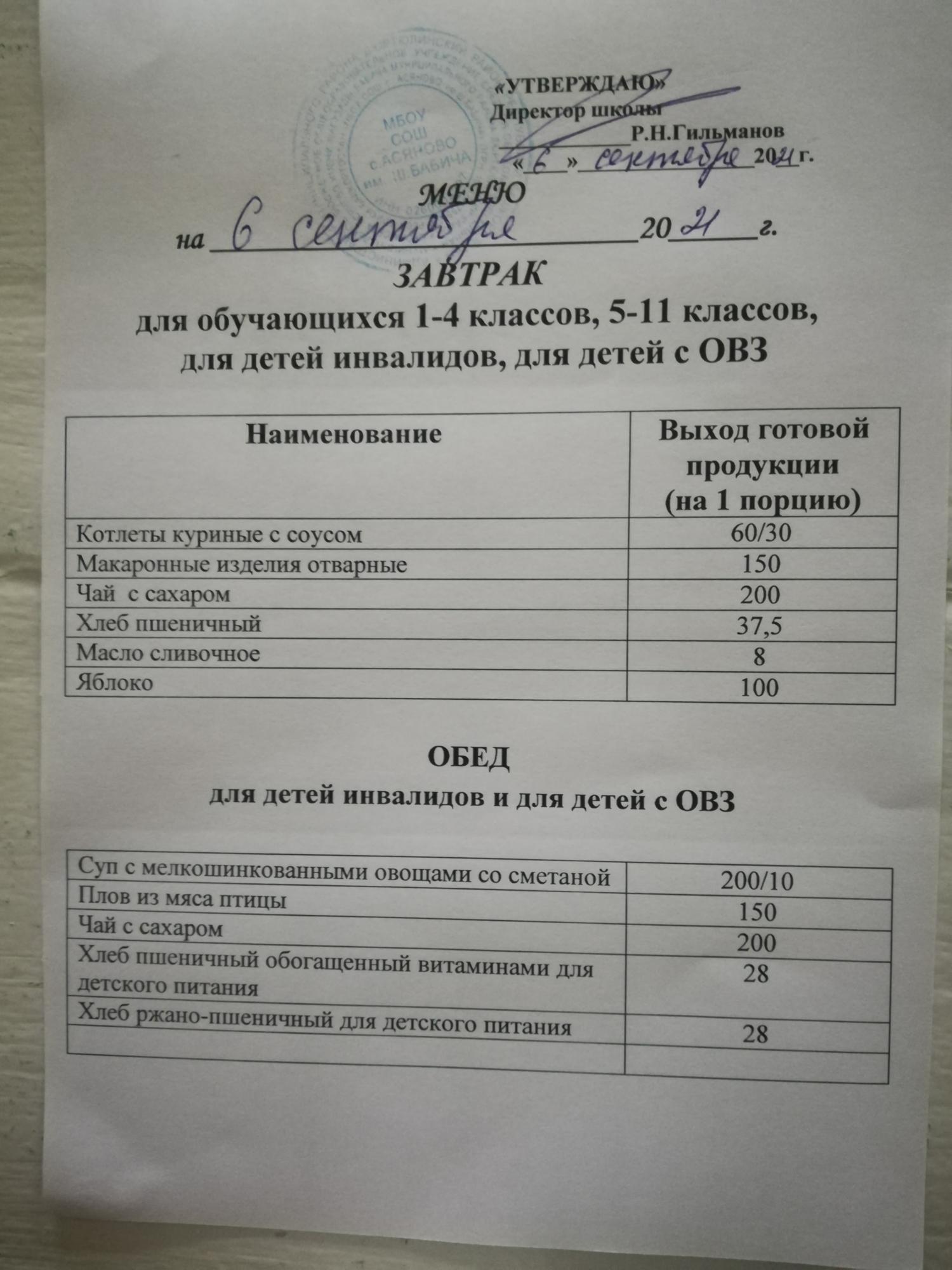 (Меню на 06 сентября 2021)
