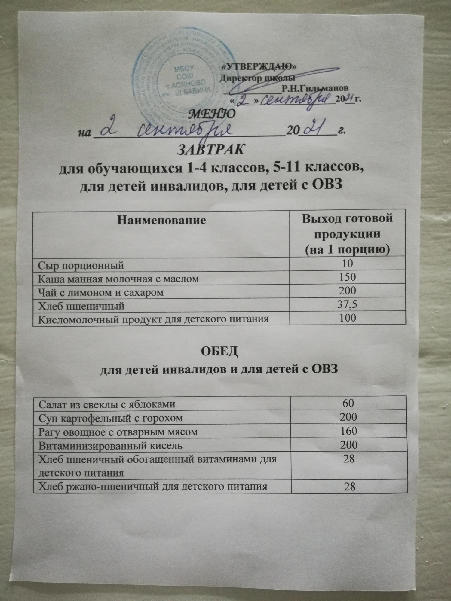 (Меню на 2 сентября 2021)