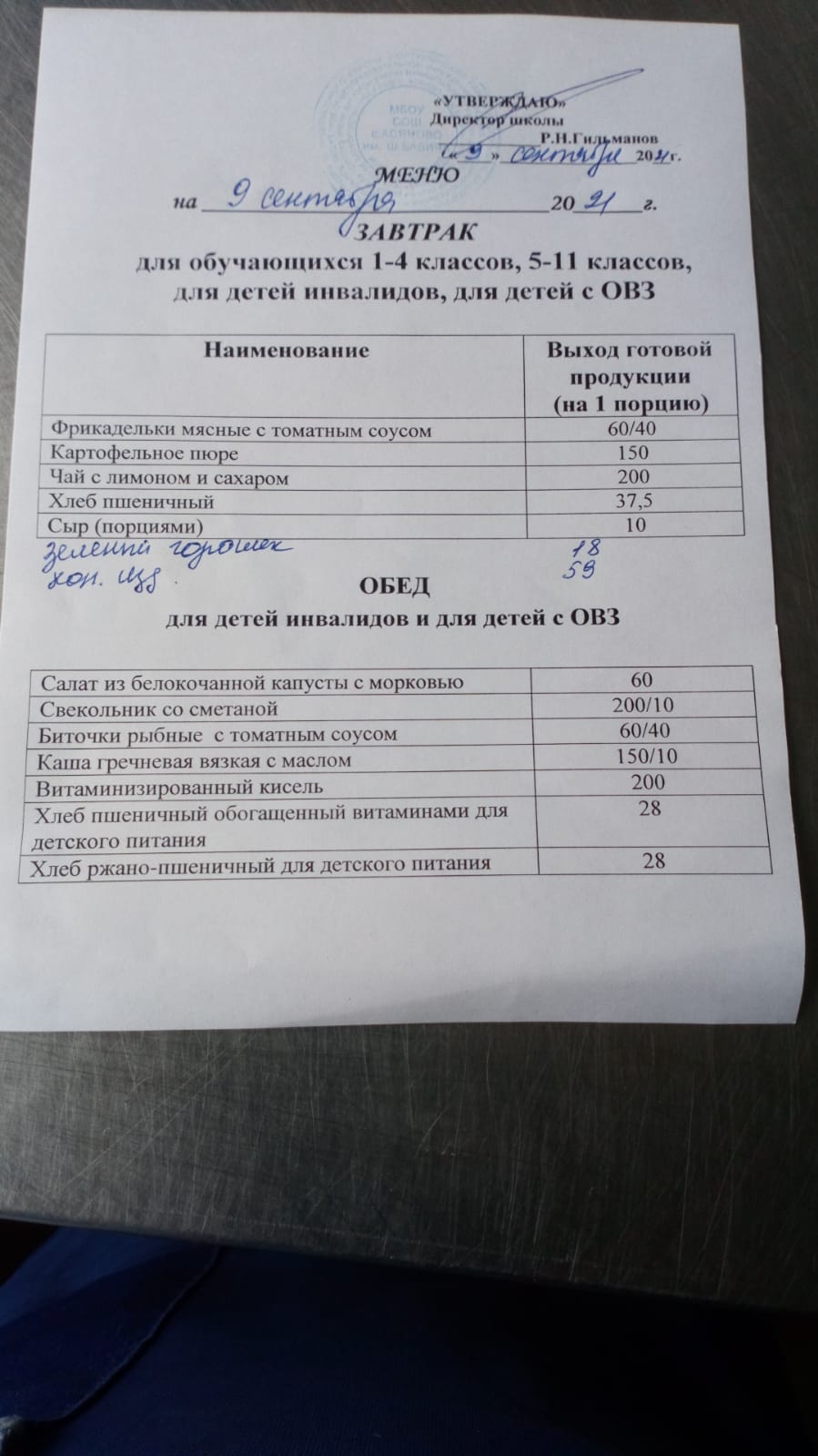 (Меню на 9 сентября 2021)